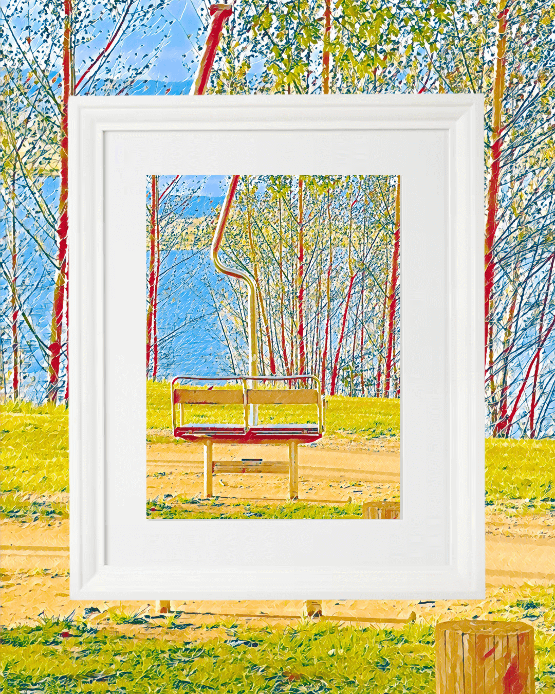 This image was taken on the foreshore of Lake Jindabyne at the Claypits. It is an old double chairlift installed as a rest-seat for walkers long the pathway. This cool Pop Art Print is one in a series of Jindabyne and Snowy Mountains images edited in this style. Select the Pop Art box in the Photography Collections to see more.